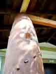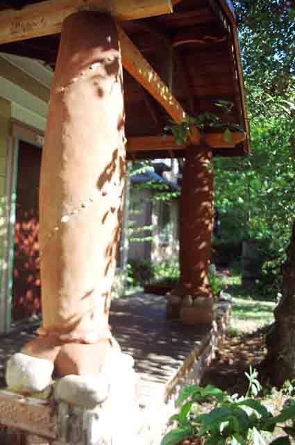 Cob on porch of existing house. Designed and built by Scott. This project demonstrates the use of cob as a decorative technique in conventional, wood construction. Each column is built around a 4" x 4" post. They stand unchanged with no maintenance.